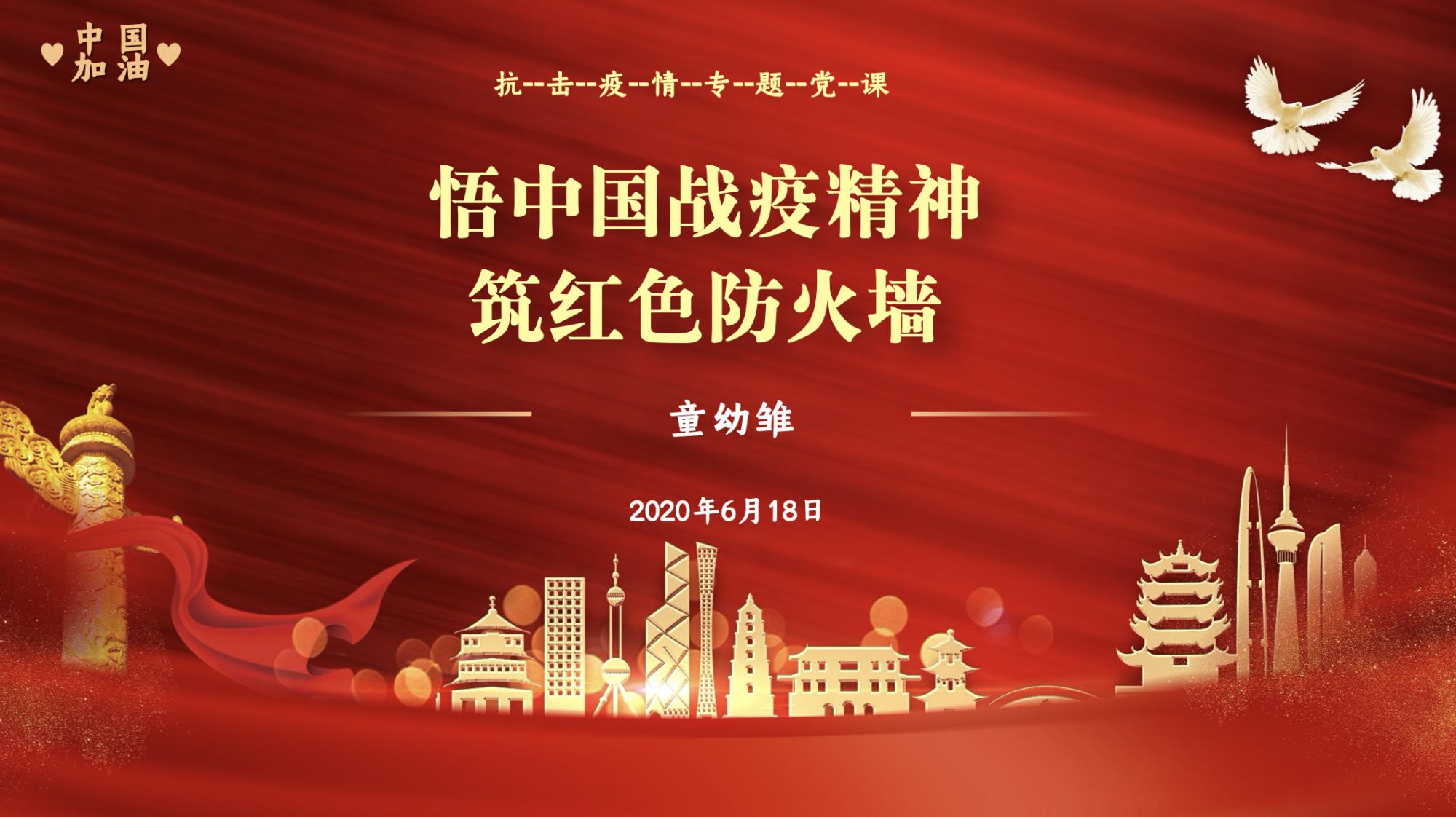 童幼雏书记以China Daily制作的视频短片《This is China》开篇,回顾了中国人民在党的领导下战胜疫情的历程,紧接着,又分别从“感悟中国精神”、“筑牢红色防火墙”两个层面展开了深入的讲解。