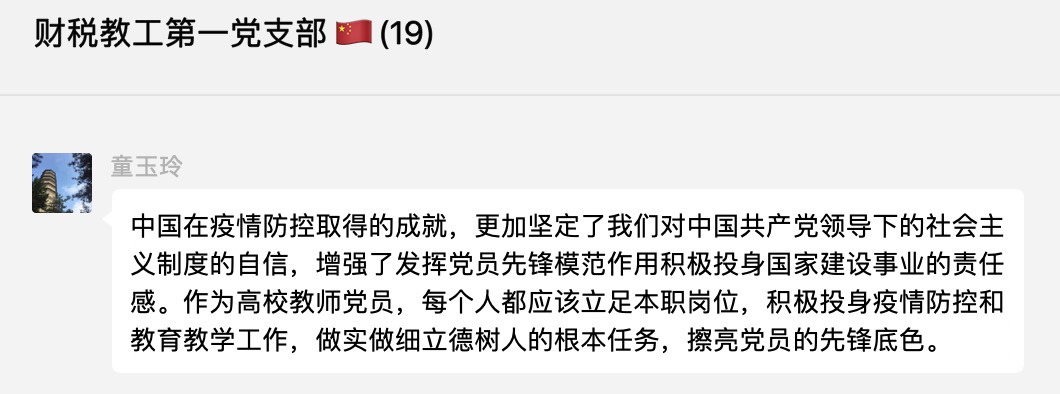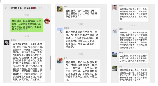 张朝阳同志认为:“牢记初心,利用假期做好本职工作,同时继续加强对疫情防控各项政策的学习,深刻认识做好疫情常态化防控的重要性,响应各项决策部署,并做好与学生的沟通交流,担起党员教师的责任与使命。”