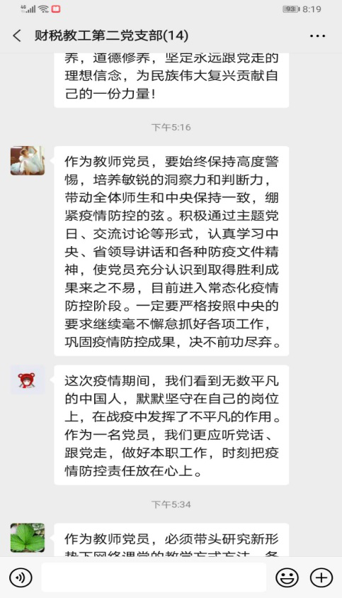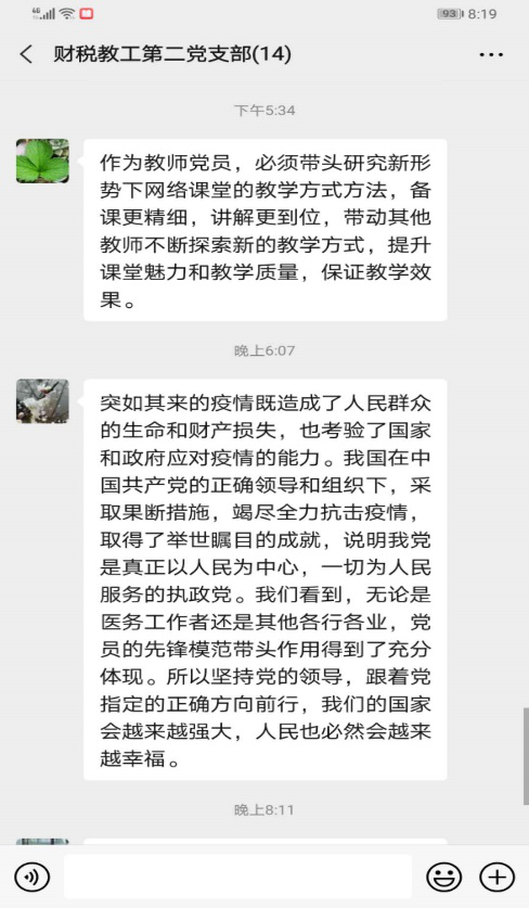 在学习微党课后,对支部成员带来了很多感触,大家踊跃在线展开了激烈的讨论。支部书记张帆指出:“党旗飘扬,构筑红色防火墙!在这次疫情中,作为党员教师,我们要进一步加强自身的党性修养,做好自己的本职工作,勇于担当,为社会贡献做出应有贡献!”