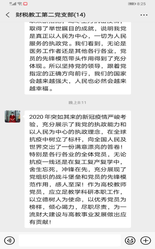 吴利群同志分享到:“2020年突如其来的新冠疫情严峻考验,充分展示了我党的执政能力和以人民为中心的执政理念,在全球抗“疫”中树立了标杆,向全国人民及世界交出了一份满意漂亮的答卷!特别是各行各业的全体党员,无论抗“疫”一线还是在复工复产复学中,舍生忘死,冲锋在先,充分展现了党组织的战斗堡垒和党员的先锋模范作用,感人至深!作为高校教师党员,应立足教学科研本职工作,以立德树人为使命,以优秀党员为榜样,倾心竭力,尽职尽责,为一流财大建设与高教事业发展做出应有贡献!”