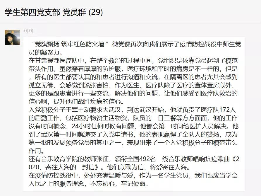 学生第四党支部组织观看高校党组织战“疫”示范微党课。本次微党课以“党旗飘扬,筑牢红色防火墙”为主题,由来自北京交通大学、中央音乐学院、西南大学、兰州大学及中国石油大学(华东)的数名党员教师讲述各高校师生扶贫、战“疫”先锋故事,展现党员冲锋精神,向中国大学生传递青春热血正能量。