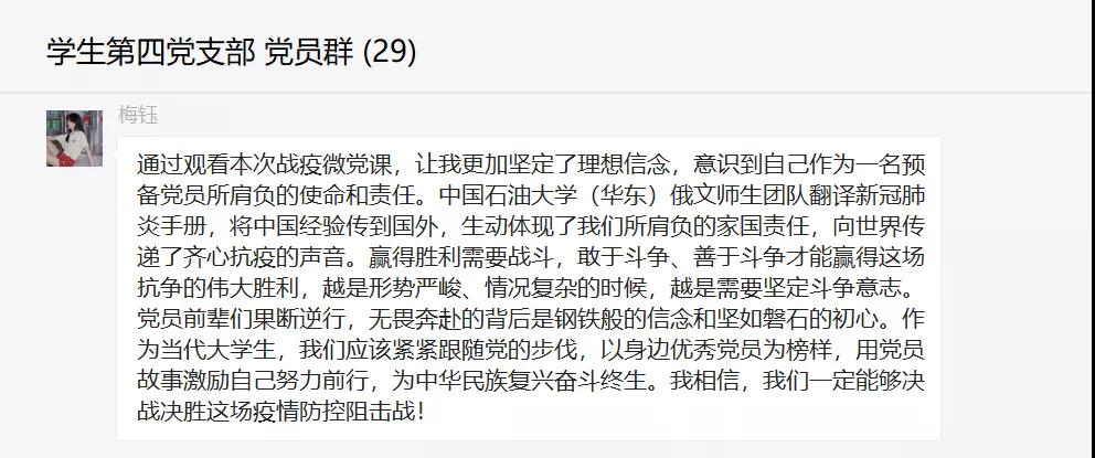 张玮同志说:“通过观看此次微党课,我加深了对党领导人民抗疫斗争的认识,也更加增强了‘三个代表’与‘四个意识’,同时坚定了‘四个自信’。作为新时代的大学生,在未来的学习工作中,我们要努力落实抗疫举措,一切行动听指挥,同时要带头讲好抗疫故事,传递中国声音,在实际生活中带头践行抗疫精神。”