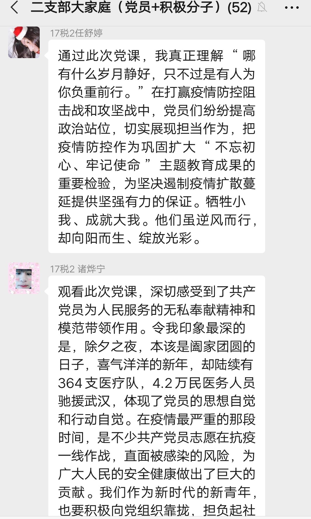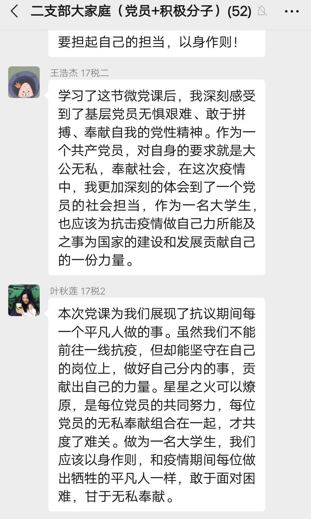 徐浩凯同学说:“学习了这期微党课以后,让我了解和认识到党员们在重大事件中的责任和担当。青年教师中即使有身患疾病的成员,也毫不犹豫且坚决地要加入到党的工作小组,不顾己身病情的恶化。而作为高校中的一名大学生,也能在抗疫过程中捐献自己所能,做出了不小的贡献,是值得我们众青年学习的。无论发生什么事件,党组织党员们的家国情怀、舍小为大、不畏艰险、直面向前的精神,在我们的心中筑起一道红色的高墙。”