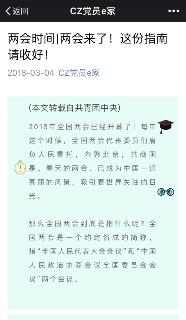 1.在党员公众号“CZ党员e家”上提前推送两会指南,引导学生提前关注两会。