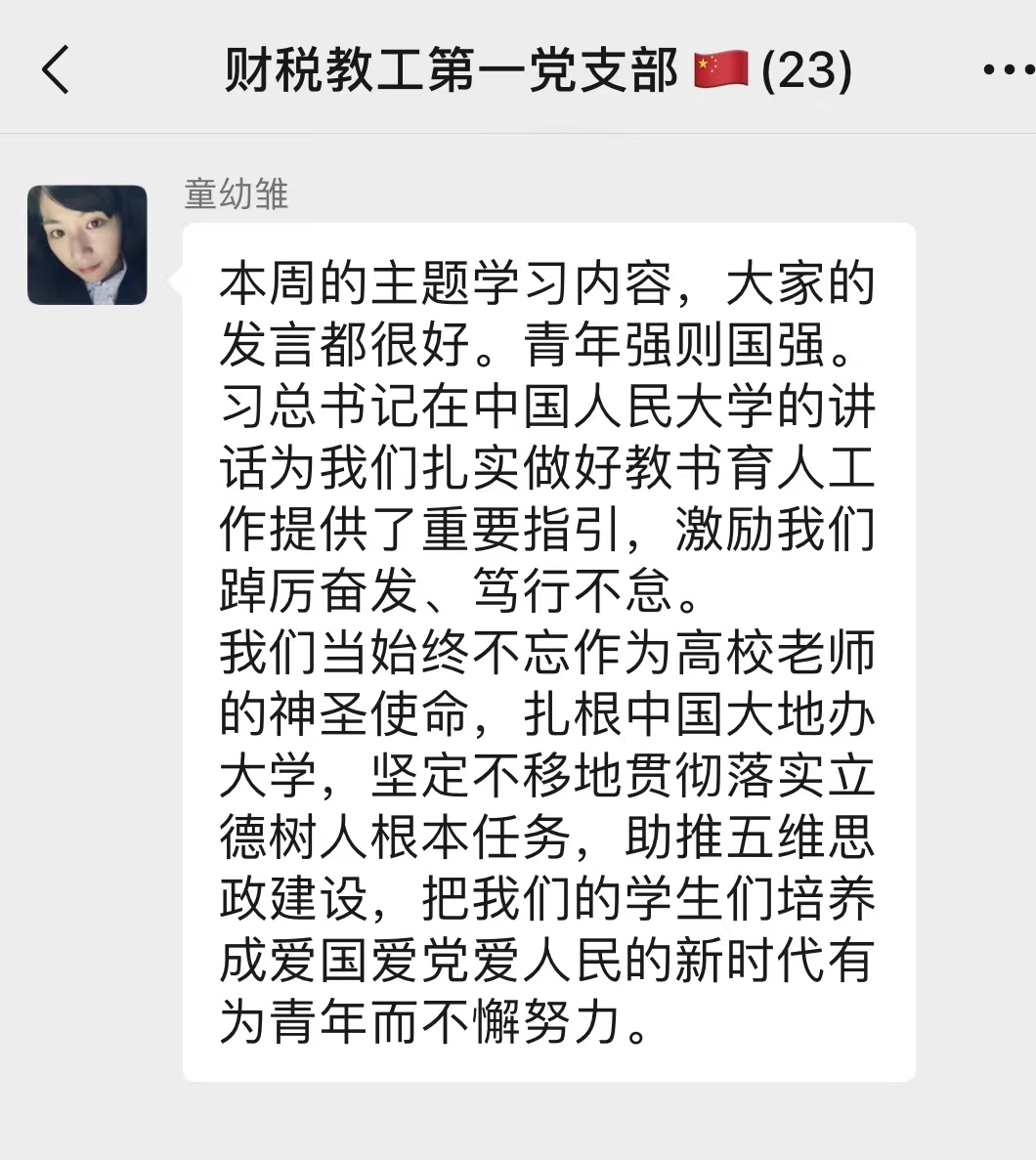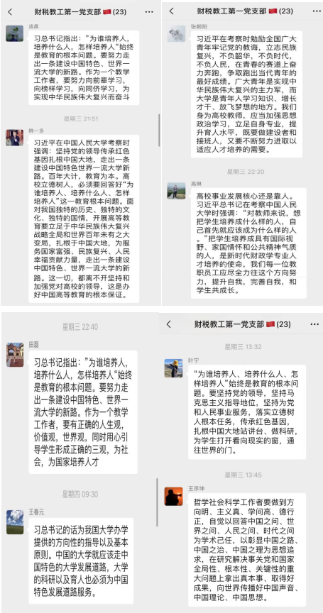 支部成员、财政系教师韩一多:习近平在中国人民大学考察时强调:坚持党的领导传承红色基因扎根中国大地,走出一条建设中国特色世界一流大学新路。百年大计,教育为本。高校立德树人,必须要回答好“为谁培养人、培养什么人、怎样培养人”这一教育根本问题。面对我国独特的历史、独特的文化、独特的国情,开展高等教育要立足于中华民族伟大复兴战略全局和世界百年未有之大变局,扎根于中国大地,为服务国家富强、民族复兴、人民幸福贡献力量,走出一条建设中国特色、世界一流大学的新路。这一切,都离不开坚持和加强党对高校的领导,这是办好中国高等教育的根本保证。