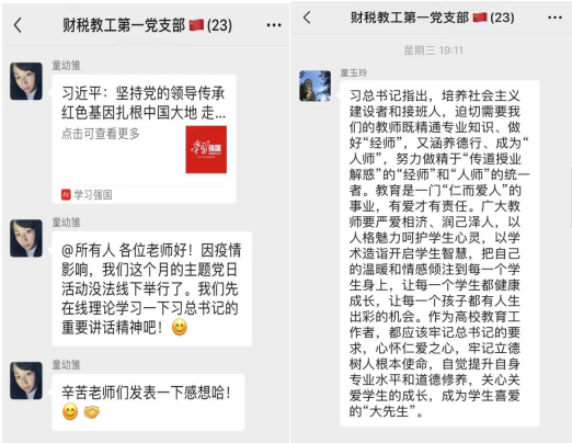 支部成员、财政系教师田磊:作为一个教学工作者,要有正确的人生观,价值观,世界观,同时用心引导学生形成正确的三观,为社会,为国家培养人才。