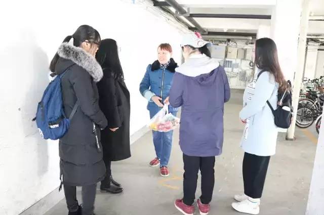 其中一组“小贝禾”志愿者来到了桃李苑15幢宿舍楼。此时,宿管阿姨正在整理车库,同学们都为宿管阿姨的敬业精神感到敬佩。当“小贝禾”志愿者把水果送给宿管阿姨时,阿姨笑着接受并且表达了对同学们的感谢。