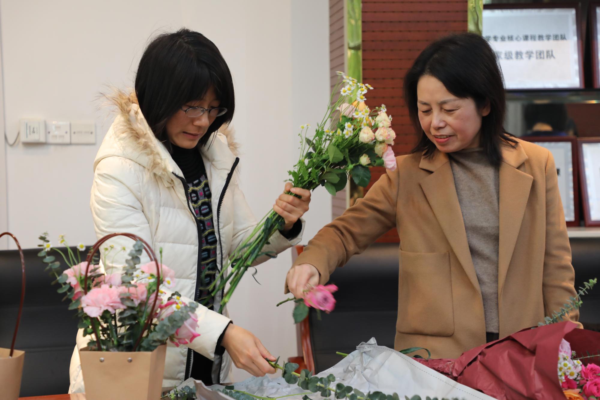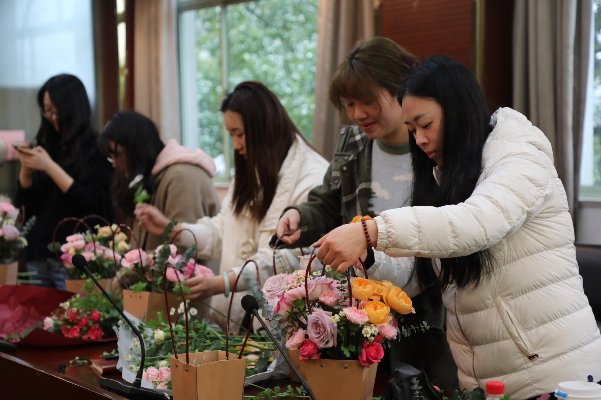 活动现场,花香四溢,学院特地邀请了专业花艺师进行现场指导,讲解花卉特点、鲜花色彩搭配以及插花技巧等。女教师们热情高涨,根据自己的审美和创意,精心构思、认真修剪,将一朵朵鲜花巧妙地搭配在一起,最终形成一件件充满创意和艺术美感的插花作品。