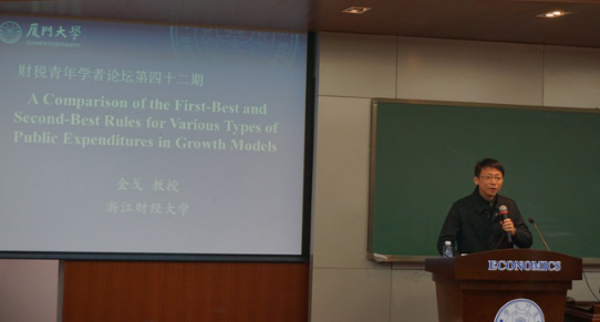3月28日下午,厦门大学经济学院财政系主办的“财税青年学者论坛第四十二期”学术讲座在经济学院N302顺利举行。中心金戈教授应邀做了题为“A Comparison of the First-Best and Second-Best Rules for Various Types of Public Expenditures in Growth Models”的精彩讲座。