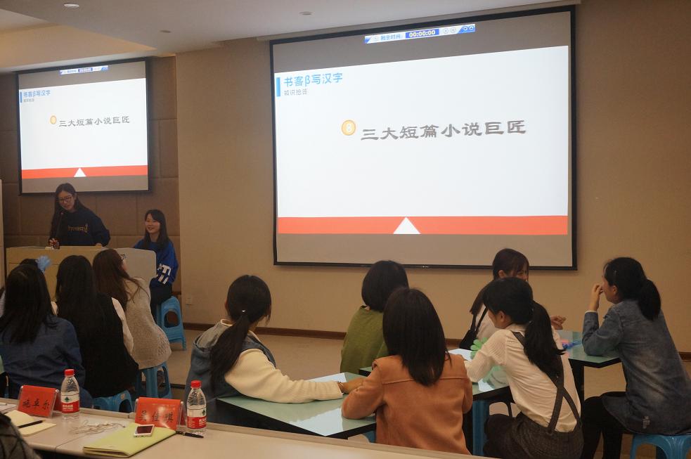 第十一届读书月系列活动之汉字听写大赛决赛在学院楼208举行。院团委副书记李滟,学生会主席朱亚慧,副主席潘心韵、施卓尔和吴佳琪出席此次了决赛。