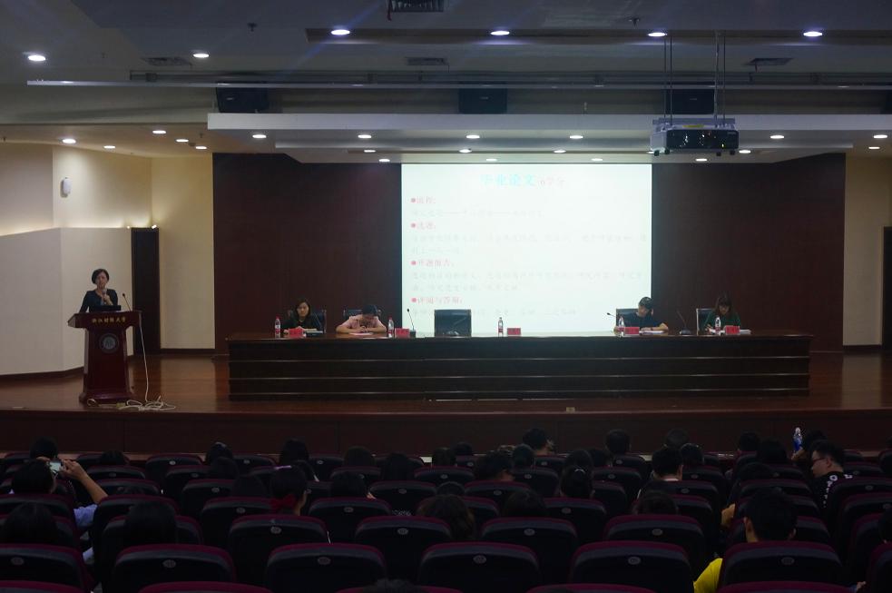 大会伊始,杨春玲副院长就毕业论文的相关事宜做了详细说明。她从毕业论文的流程、选题、开题报告和答辩四个方面展开介绍。她强调:对于毕业论文的每个环节,学校都将严格把关,严打抄袭,希望同学们诚实严谨地完成自己的毕业论文。她建议同学们选题与专业密切相关,角度要小,做到“小题大做”。她以历年学生的选题举例说明,使在座同学对选题的要求更为明确。随后,关于毕业实习,杨老师提出了具体要求与自己的看法。她主张同学们去专业相关的单位实习,而且实习内容应该为本专业所学习的知识技能。她也建议同学们不要急于实习而过早地离开学校,因为学校丰富的资源并非校外所能拥有。