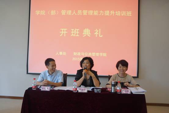 举办的2015年教师专业发展培训项目——“学院(部)管理人员管理能力提升培训”在1号楼208报告厅隆重开班并顺利完成了第一、二讲内容。学校党委委员、人事处邵毅平处长、童夏雨副处长出席开班典礼,来自我校各个学院(部)的60多位管理人员参加了培训班,开班典礼由学院党总支书记吴利群主持。