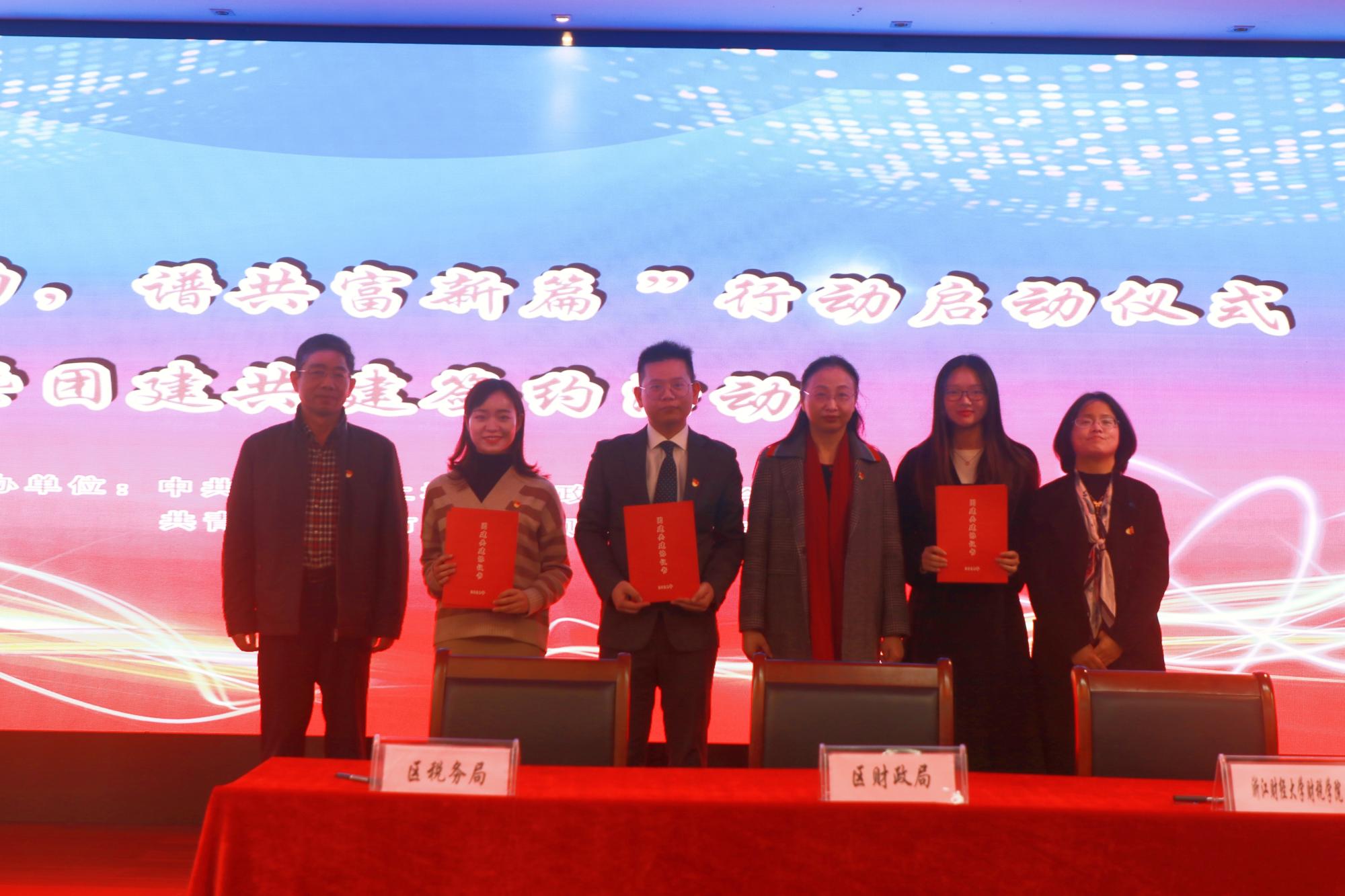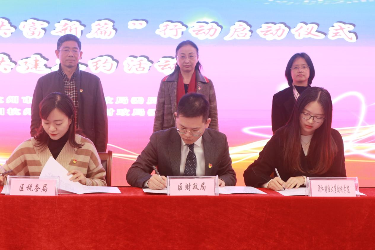团委与上城区财政局团委、上城区税务局团总支举行团建共建签约仪式。上城区财政局党委书记、局长石荣祥,团区委书记赵丹晨,杭州团市委基层工作部副部长郑宏,市财政局团委副书记张斌豪,上城区财政局党委副书记、副局长、行业党委书记潘丽华,上城区税务局二级高级主办郑利民,学院党委副书记徐丽玲及三方团组织负责人等出席了仪式。