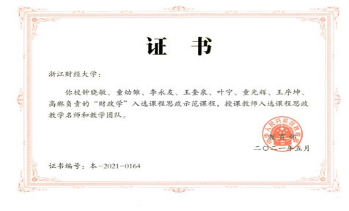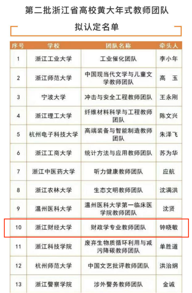 为深入贯彻落实习近平总书记关于黄大年同志先进事迹的重要指示精神,根据教育部关于开展高校黄大年式教师团队创建活动的统一部署,经学校推荐、专家审核、名单公示等程序,浙江财经大学“财政学专业教师团队”荣获第二批浙江省高校黄大年式教师团队。