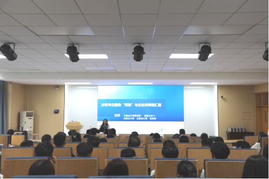 讲座内容包括两部分。第一部分是介绍涉税专业服务“两则”。重点解读涉税专业服务“两则”和从事涉税专业服务的具体路径。胡老师结合自己丰富的职场经验,与学生们分享了职业生涯规划的心得感悟。关于未来从事涉税专业服务的路径,胡老师介绍了纳税申报代理、涉税鉴证、专业税务顾问等方向的工作内容,助力学生们提升专业能力、明确职业发展路径。