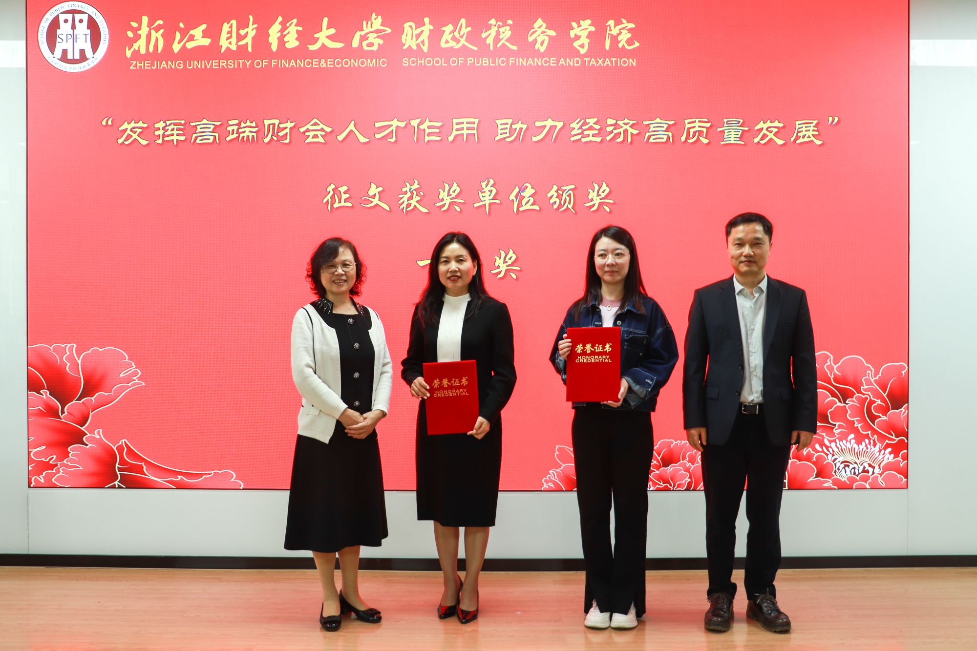 向浙江省总会计师协会对此次活动的大力支持表示由衷的感谢。随后举行了征文获奖单位颁奖仪式,俞乐平女士和付文林院长作为颁奖嘉宾为一等奖获得者颁奖,学院教师董根泰、黄冠豪和蒲龙为二等奖、三等奖获得者颁奖,颁奖仪式结束后所有与会嘉宾移步至学院楼正门合影留念。