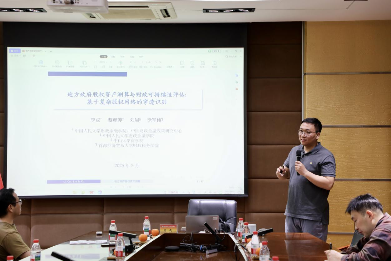 2025年5月12日上午,财税基础理论与政策双周论坛第3期在学院楼307室举行。本次论坛特邀中国人民大学财政金融学院教授、博士生导师李戎担任主讲嘉宾,聚焦“地方政府股权资产测算与财政可持续性评估:基于复杂股权网络的穿透识别”这一前沿主题。