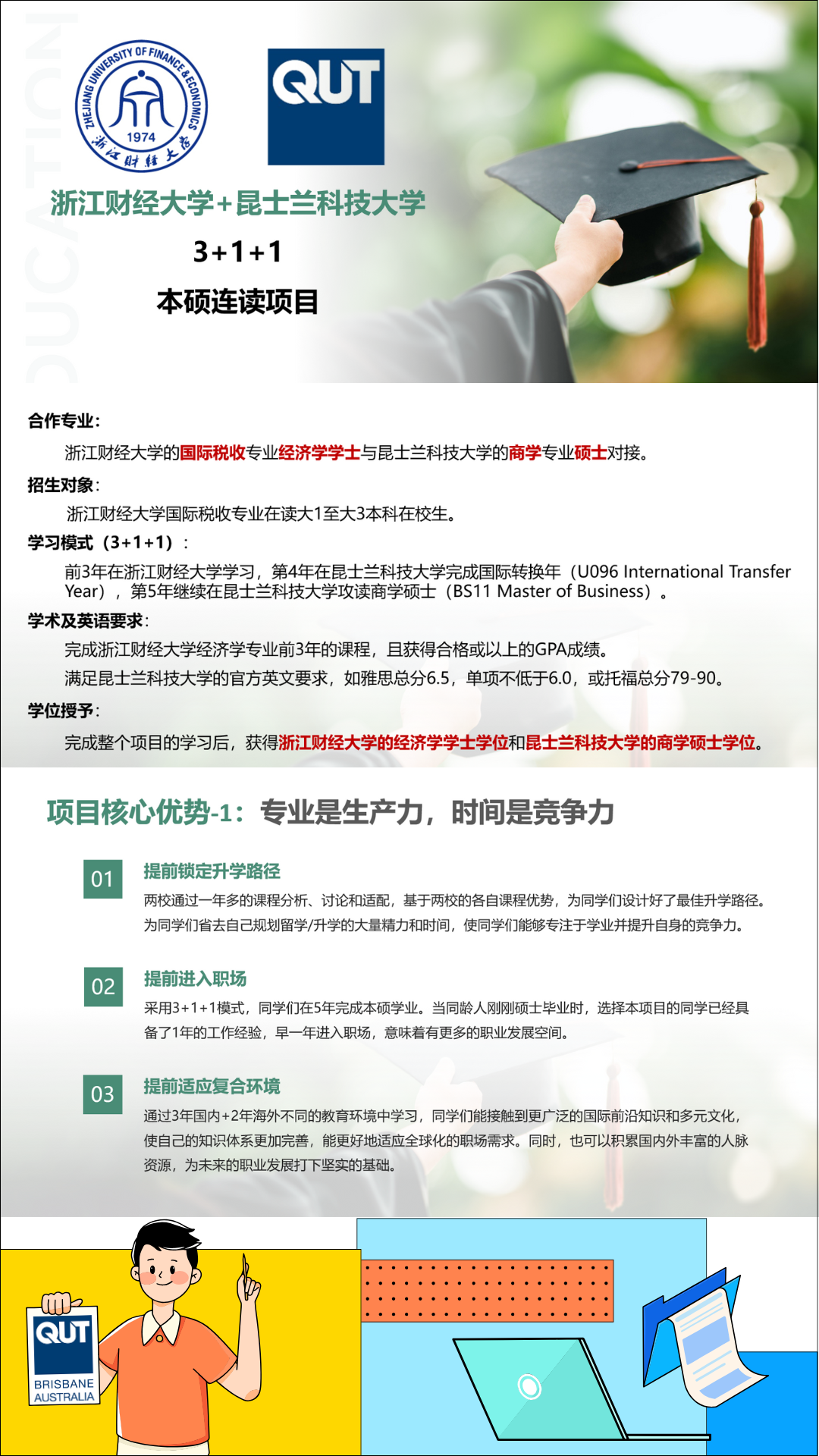 Tommy先生介绍了浙财-昆士兰科技大学3+1+1本硕连读项目,面向浙江财经大学大三学生。学生前三年在浙财完成本科学习,后两年在昆士兰科技大学(QUT)学习,包括一年的U096 International Transfer Year和一年的BS11 Master of Business硕士课程。项目毕业生将获得浙江财经大学经济学学士学位和QUT商学硕士学位,学位受QUT认证,并有资格申请澳大利亚毕业生工作签证。Tommy先生强调了项目的学术优势和职业前景。