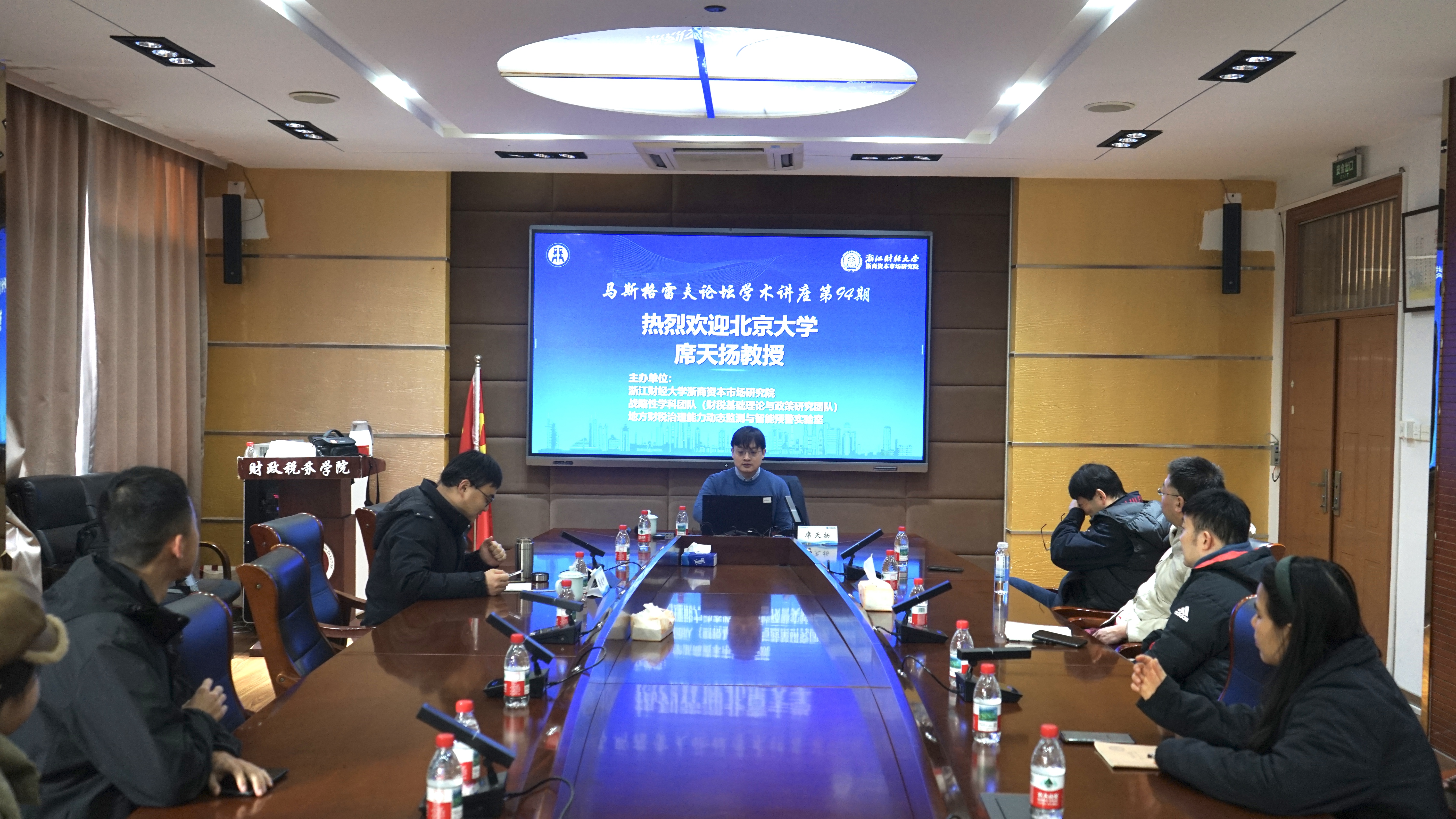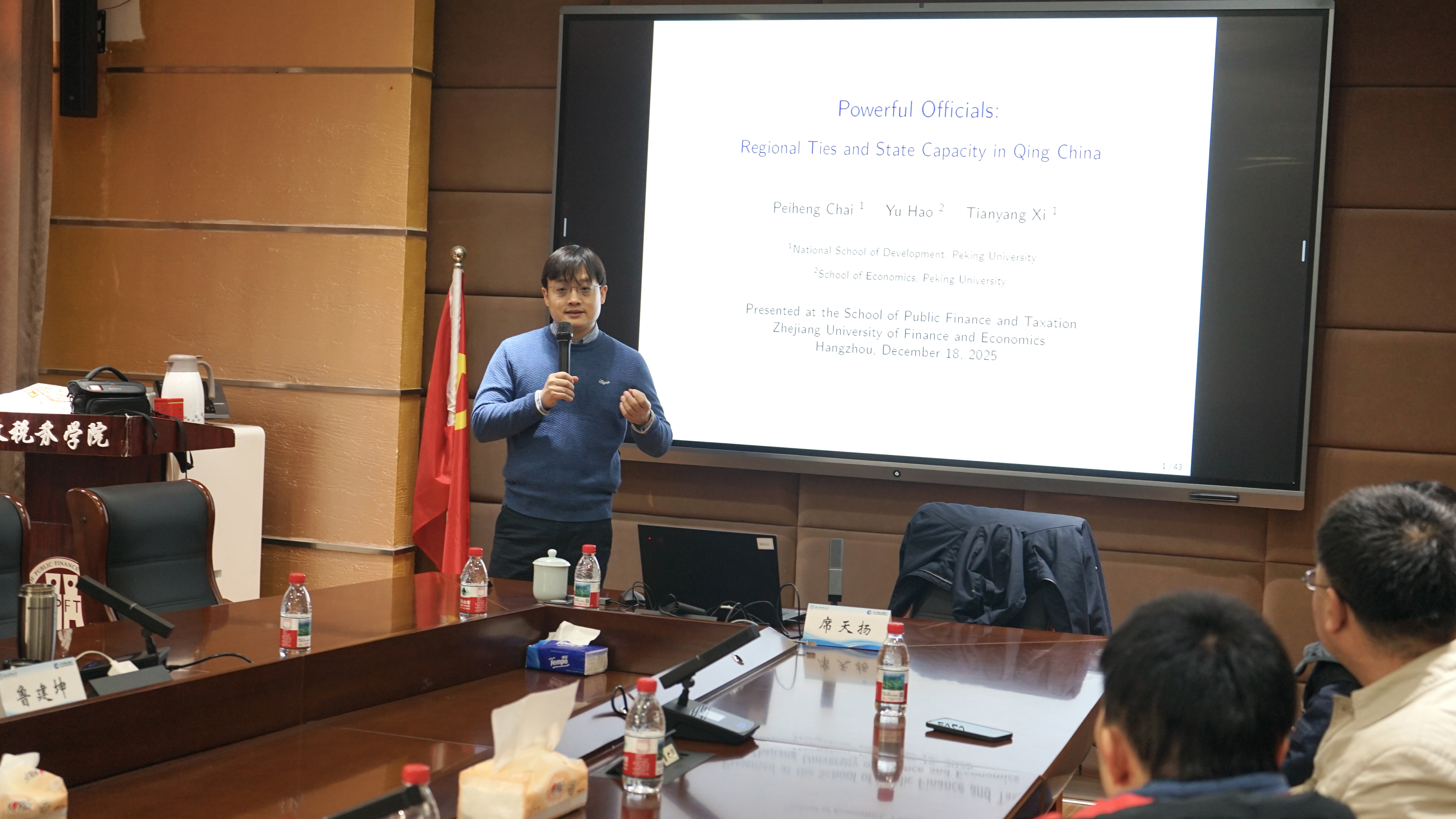 2025年12月18日上午,由浙江财经大学《财税基础理论与政策》战略性学科团队、地方财税治理能力动态监测与智能预警实验室及浙商资本市场研究院联合主办的马斯格雷夫论坛第94期在财税学院307会议室举行。本期论坛特邀北京大学国家发展研究院长聘副教授席天扬担任主讲人,深度分享其关于清代政治经济的重要研究成果。本次论坛由鲁建坤教授主持。