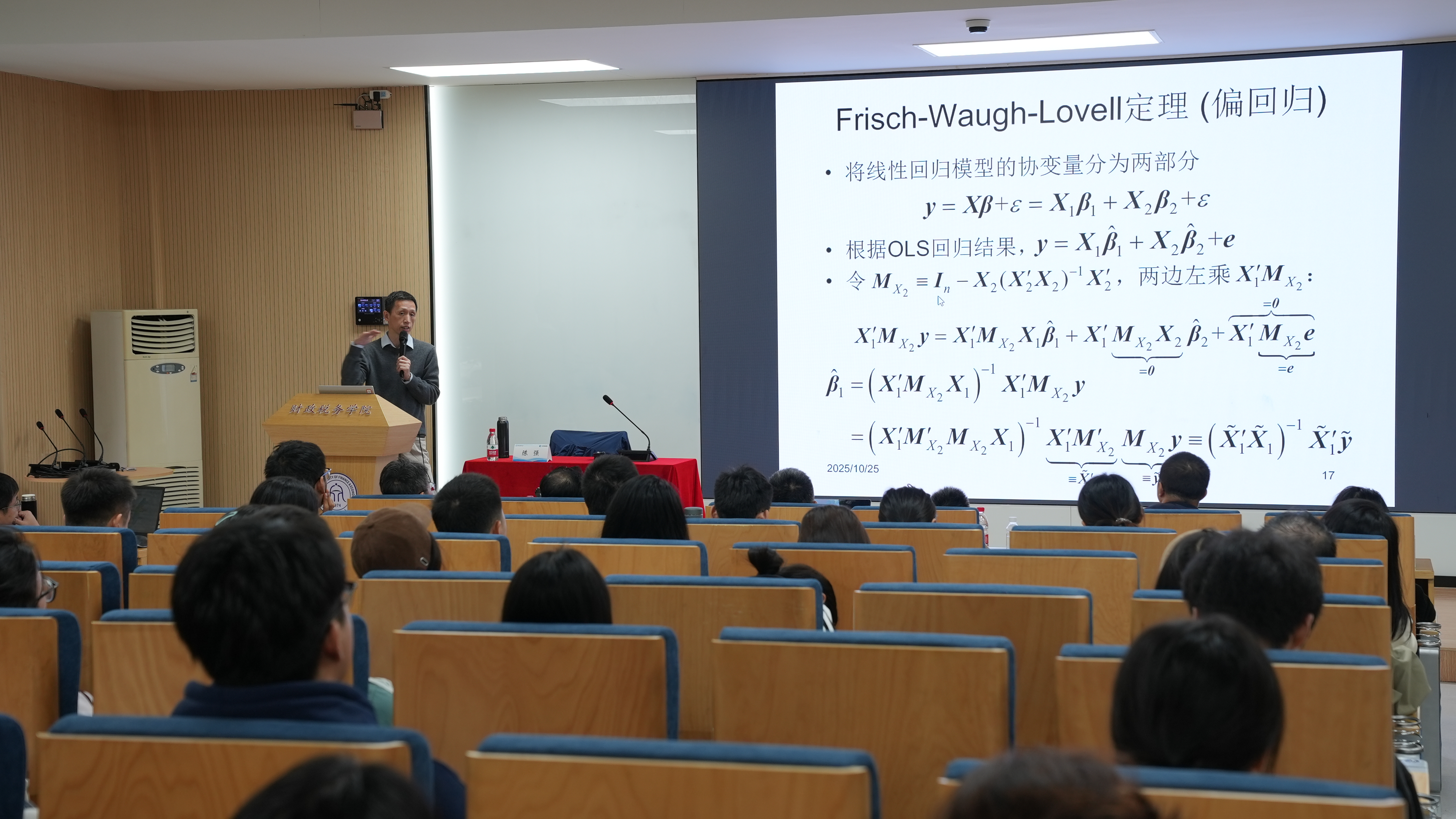 2025年10月26日上午,由浙江财经大学浙商资本市场研究院、战略性学科团队(财税基础理论与政策研究团队)和地方财税治理能力动态监测与智能预警实验室联合邀请山东大学陈强教授作主题授课,在下沙校区顺利举行。本次课程以“机器学习与因果推断”为主题,系统梳理了机器学习方法在经济学因果推断中的应用进展。本次课程旨在探讨机器学习在高维数据分析和因果推断中的最新应用,吸引了来自全校各院系的百余位师生及校外学者积极参与。
