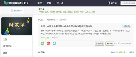 从课程讨论区学员们的留言来看,本课程很受欢迎。对于和财政学相关的其他经济学分支课程,他们也表示很期待。基于此,我校可以充分利用慕课资源,加强课程组建设,进一步扩大学校的影响力。