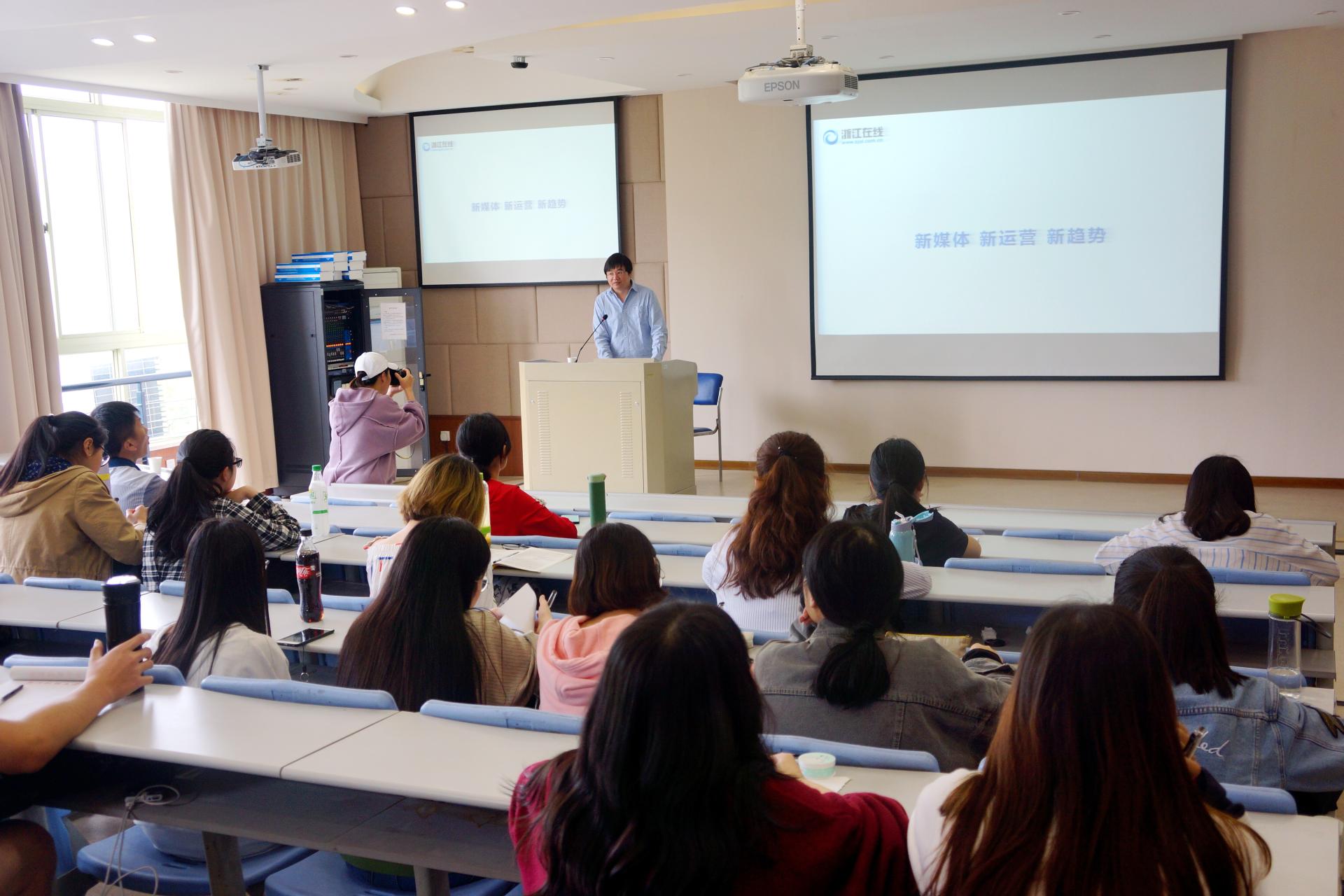 楼208教室作了题为“新媒体,新运营,新趋势”的报告。本次报告作为财经新闻专业 “基地精英进课堂”活动,由CBA直播