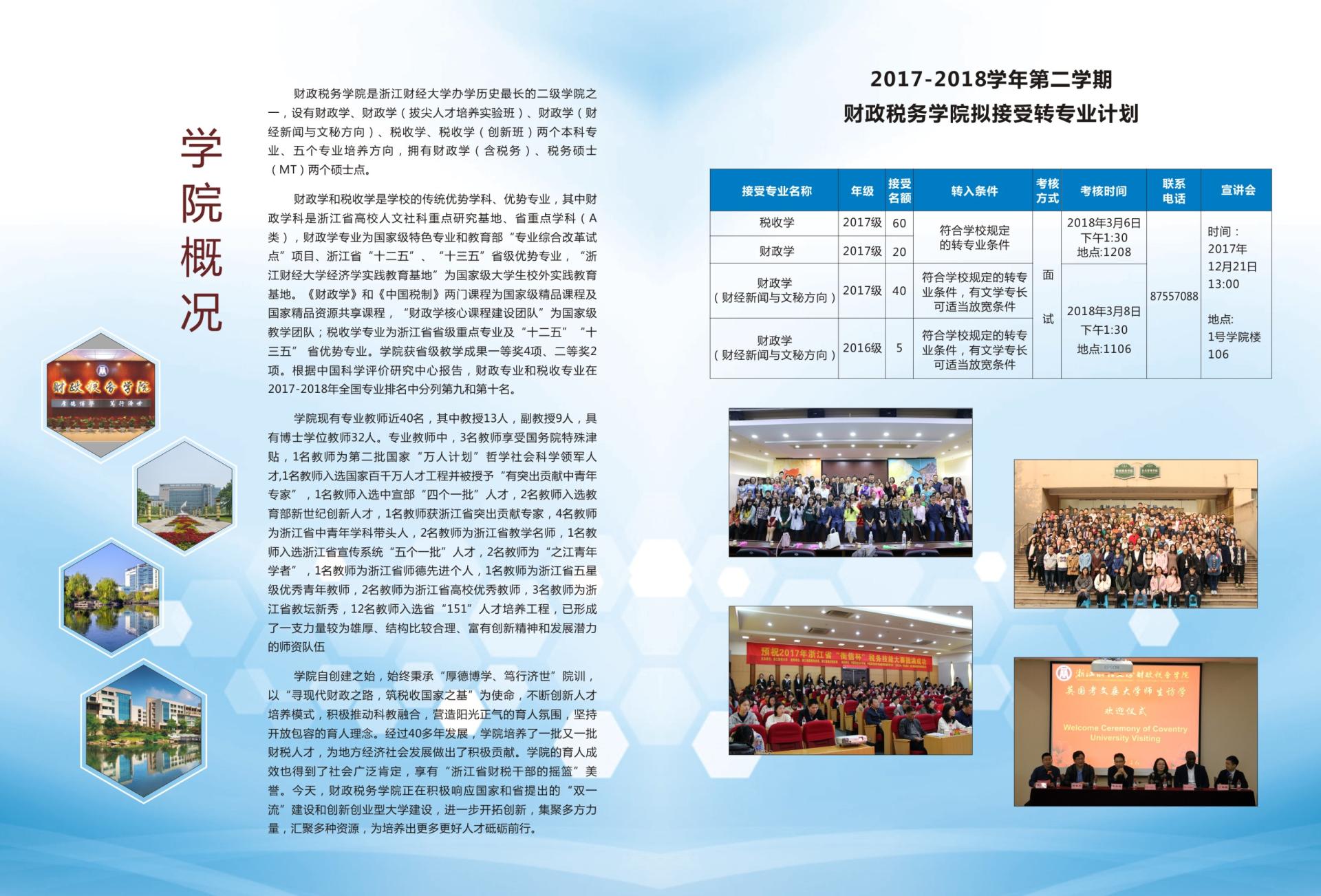 为确保下学期开学第一周转专业工作的顺利进行,经学院研究决定召开2017-2018学年第2学期转专业宣讲会,财政学、财政学(财经新闻与文秘方向)、税收学三个专业将派遣资深专业教师在现场解答与本次转专业相关的各种问题,热烈欢迎有意向的同学前来咨询。
