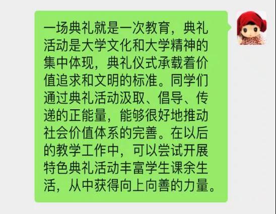 刘丹同志认为:“一场典礼就是一次教育,典礼活动是大学文化和大学精神的集中体现,典礼仪式承载着价值追求和文明的标准。同学们通过典礼活动汲取、倡导、传递的正能量,能够很好地推动社会价值体系的完善。在以后的教学工作中,可以尝试开展特色典礼活动丰富学生课余生活,从中获得向上向善的力量。”