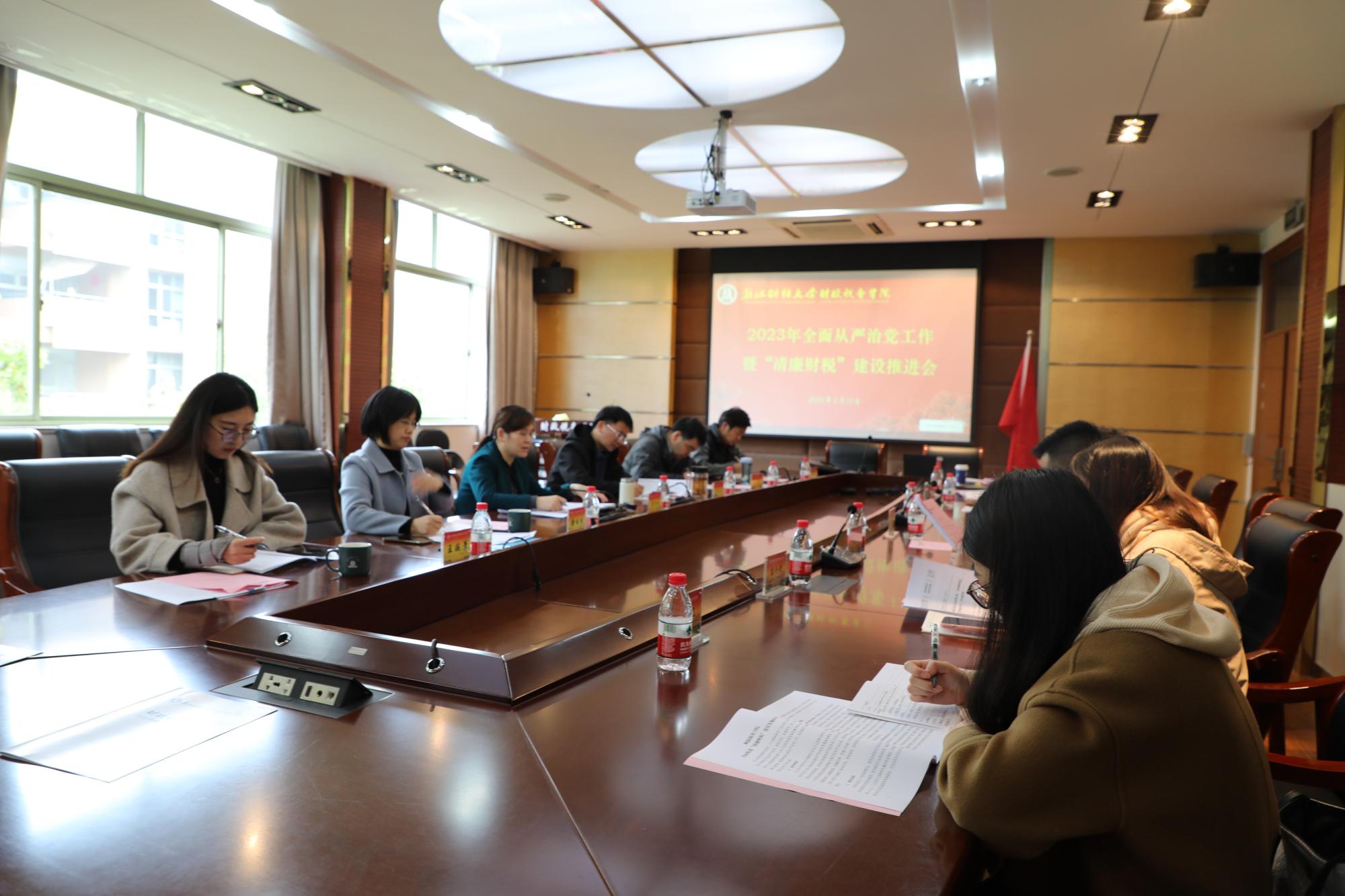 党委在1号学院楼307会议室召开2023年全面从严治党暨“清廉财税”建设推进会。学院领导班子、党委委员、纪委委员、系室主任、支部书记参加会议,会议由院党委书记童玉玲主持。