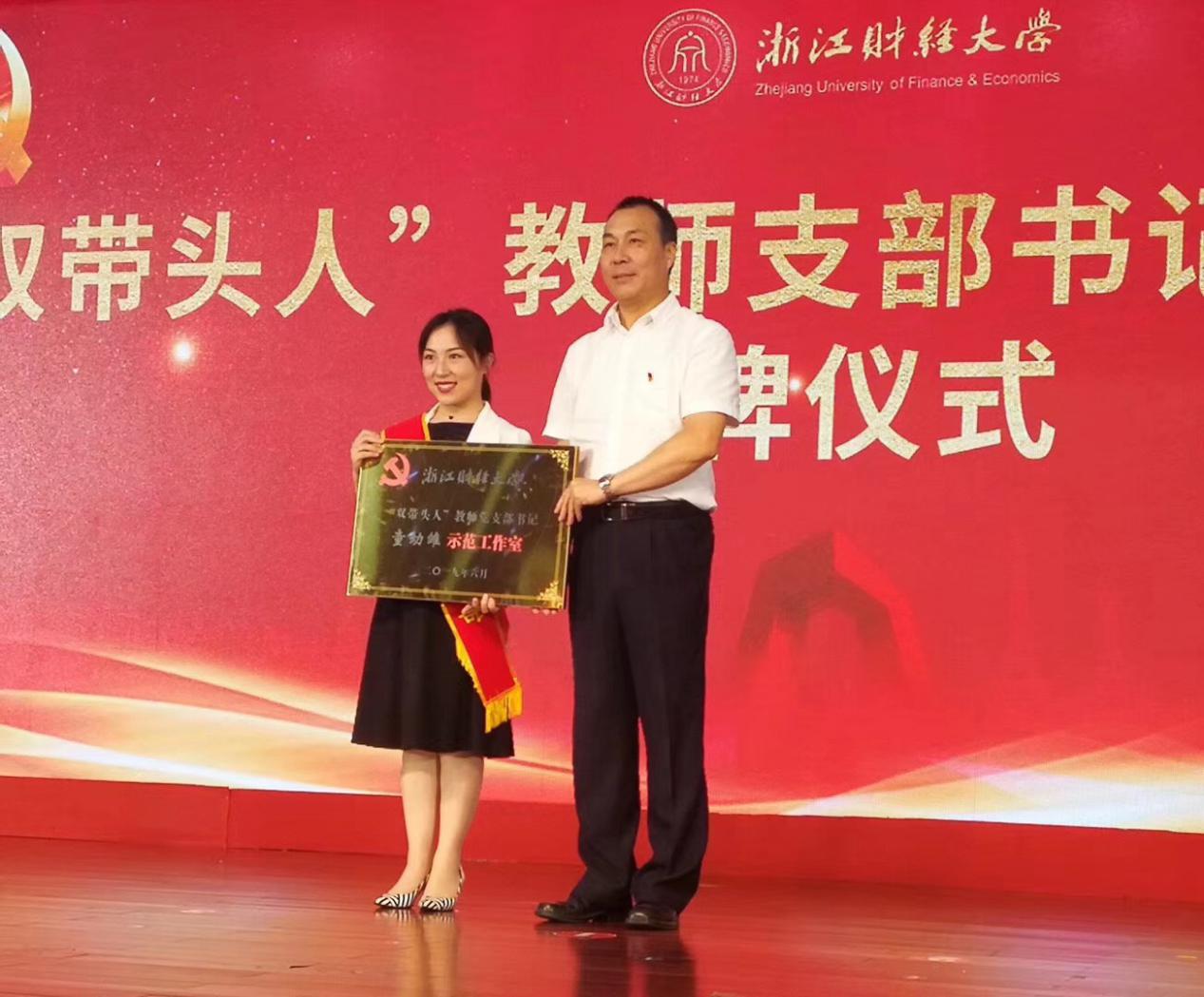 教工第一党支部书记童幼雏带领全体“双带头人”教师党支部书记宣誓,并由校党委书记李金昌授予“双带头人”教师党支部书记示范工作室牌。