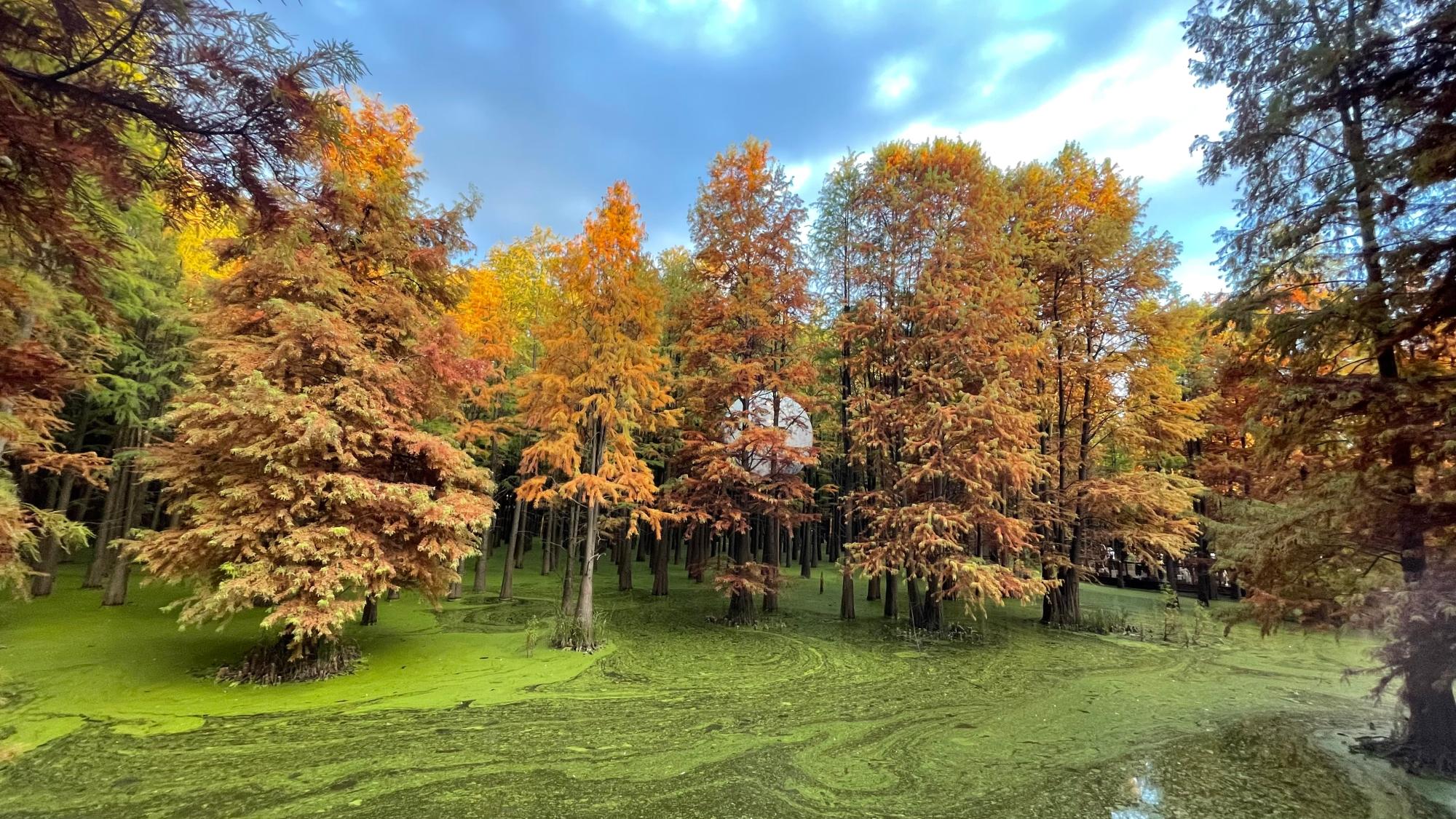 午后,大家一起乘车抵达青山湖景区。大家沿着蜿蜒曲折的水中栈道,欣赏着金色阳光下池杉投下的高大笔直身影,与它护卫的绿色湖面,两相错落交织,相映成画。一行人不紧不慢地摄影,欣赏着“树在水中长,鸟在枝头鸣”,构成了一幅“人在画中游”的美景。