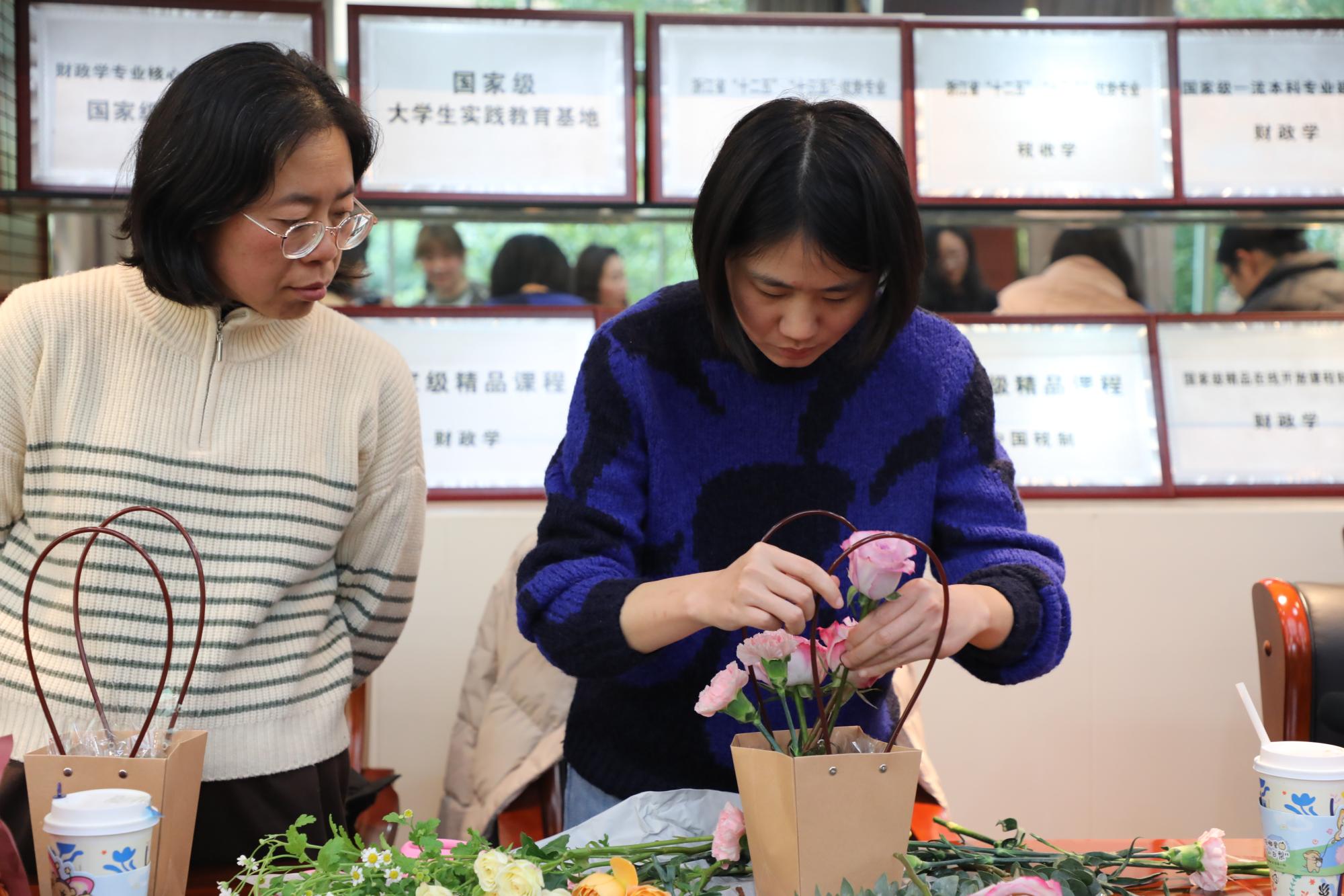 活动现场,花香四溢,学院特地邀请了专业花艺师进行现场指导,讲解花卉特点、鲜花色彩搭配以及插花技巧等。女教师们热情高涨,根据自己的审美和创意,精心构思、认真修剪,将一朵朵鲜花巧妙地搭配在一起,最终形成一件件充满创意和艺术美感的插花作品。