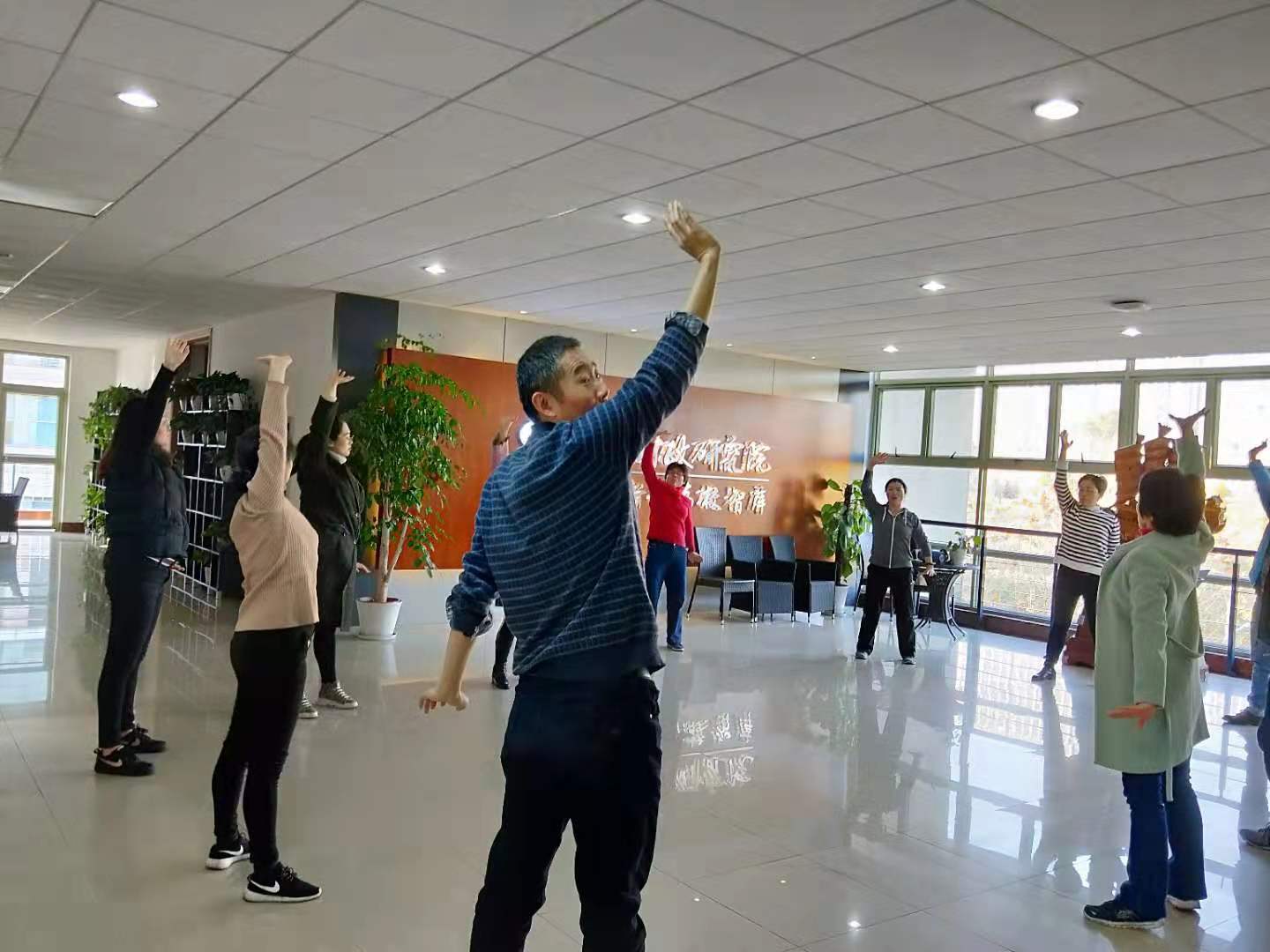 工会50余名教职工在学院三楼学习练习健身功法“八段锦”。