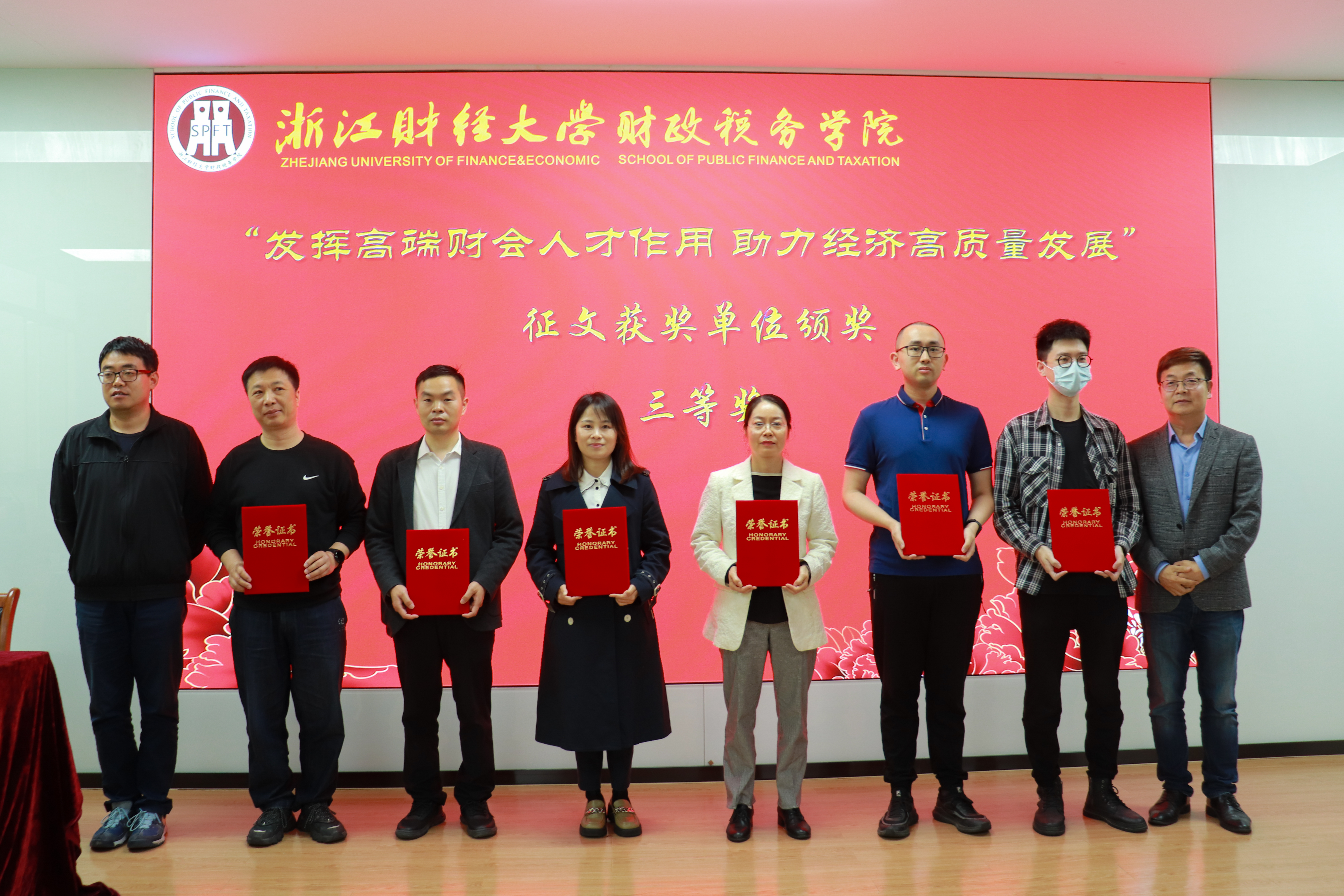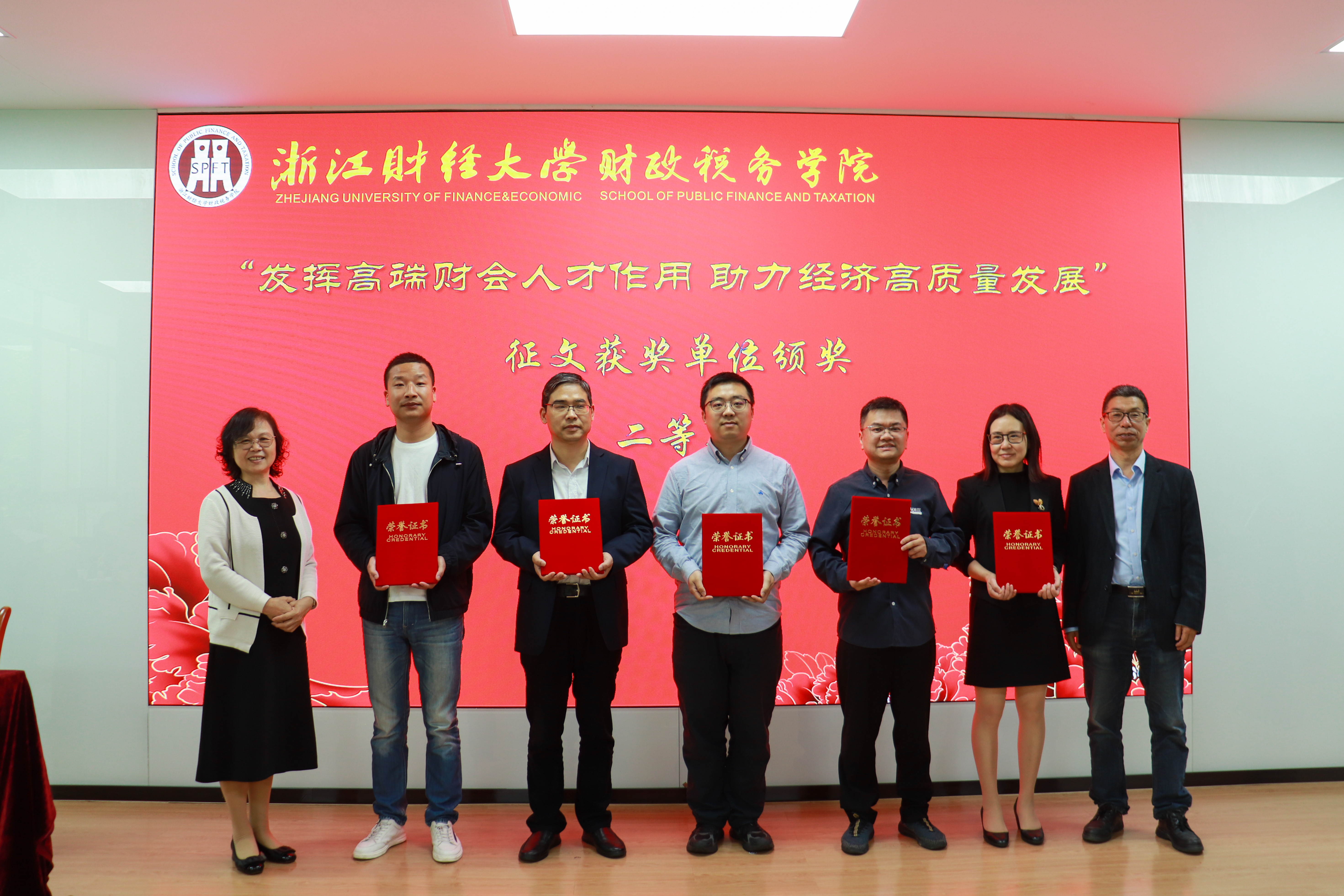 向浙江省总会计师协会对此次活动的大力支持表示由衷的感谢。随后举行了征文获奖单位颁奖仪式,俞乐平女士和付文林院长作为颁奖嘉宾为一等奖获得者颁奖,学院教师董根泰、黄冠豪和蒲龙为二等奖、三等奖获得者颁奖,颁奖仪式结束后所有与会嘉宾移步至学院楼正门合影留念。