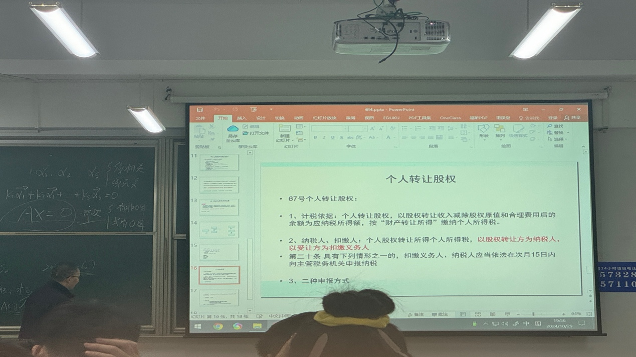 杨春根老师针对企业还有个人转让股权相关税务处理进行详细的讲解,结合小案例和数据进行讲解,贴近生活,让同学们更容易的理解,形成系统的知识体系,让我们对基本运作涉税相关内容有了更全面的认识,使学生们受益匪浅。