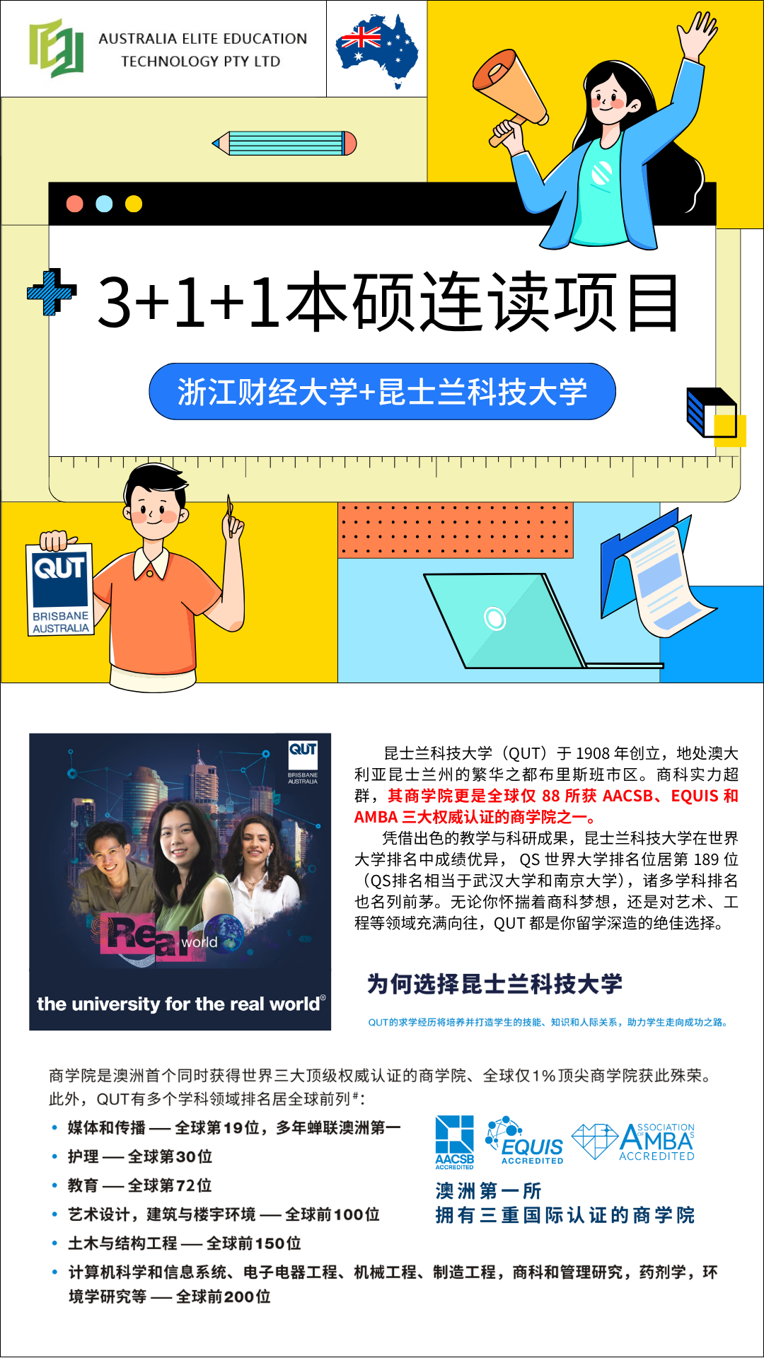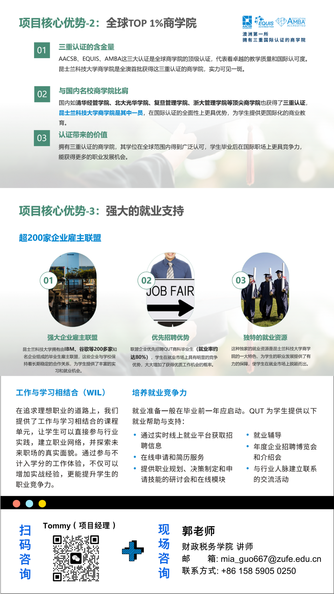 Tommy先生介绍了浙财-昆士兰科技大学3+1+1本硕连读项目,面向浙江财经大学大三学生。学生前三年在浙财完成本科学习,后两年在昆士兰科技大学(QUT)学习,包括一年的U096 International Transfer Year和一年的BS11 Master of Business硕士课程。项目毕业生将获得浙江财经大学经济学学士学位和QUT商学硕士学位,学位受QUT认证,并有资格申请澳大利亚毕业生工作签证。Tommy先生强调了项目的学术优势和职业前景。