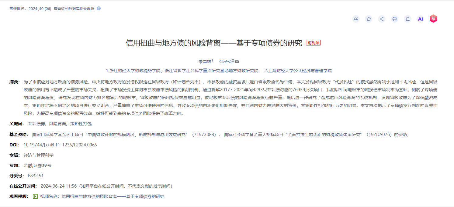 朱星姝博士发表于《管理世界》的论文《信用扭曲与地方债的风险背离——基于专项债券的研究》获基础理论研究优秀成果奖青年奖。