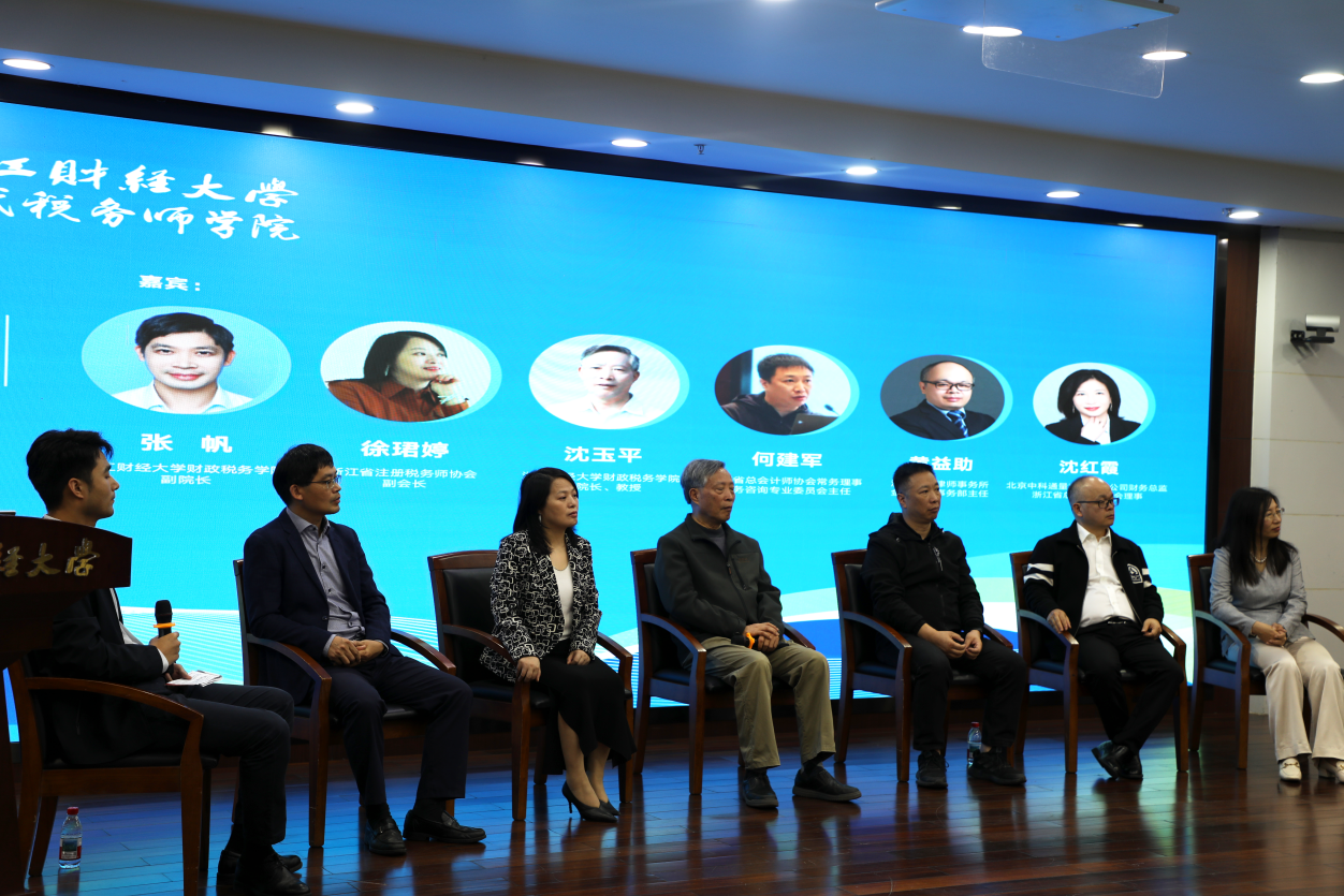 副院长张帆教授等嘉宾分别围绕本次主题,就主持人提出的“企业清算应如何进行税务处理及有哪些分类”、“研发加计扣除的监管现状及企业应如何应对”、“如何理解‘贷款服务进项税额能否在销项税额中抵扣’条款在新颁布的《增值税法》已取消而本次增值税法实施条例中仍保留”、“以公允价值核算的情况下,折旧额能否在企业所得税税前扣除”、“房东(企业)因租客(企业)经营不善未收到房租却仍需缴纳税款的应对策略”以及“浙江财经大学如何实现产教融合、校企融合”等社会关注的热点问题进行了详细解答与热烈讨论。