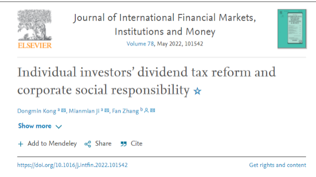 张帆副教授与合作者发表的研究论文《Individual investors’ dividend tax reform and corporate social responsibility》,在国际一流期刊《Journal of International Financial Markets, Institutions and Money》(JIFMIM)接受发表,该期刊为我校一级A期刊。