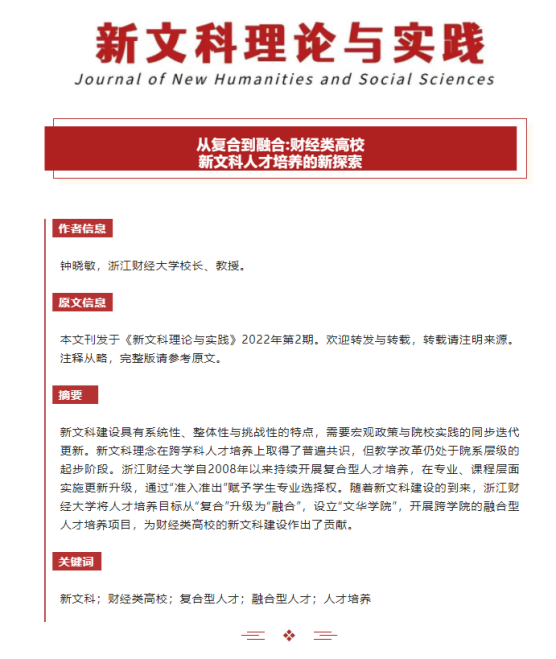 钟晓敏教授独著的教改论文“从复合到融合:财经类高校新文科人才培养的新探索”在《新文科理论与实践》2022年第2期发表。