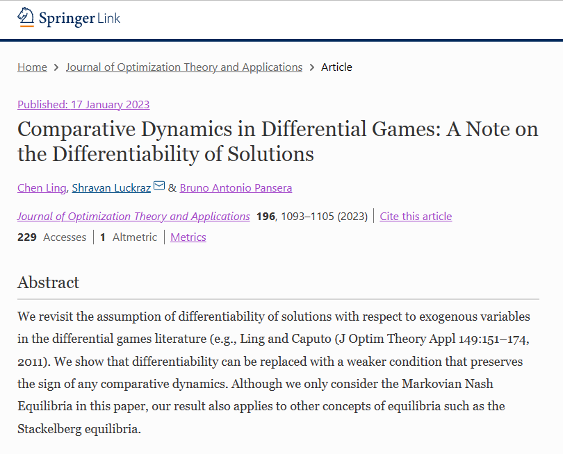 近日,我院凌晨教授、Shravan Luckraz教授和意大利雷焦卡拉布利亚地中海大学Bruno A. Pansera教授合作的论文《Comparative Dynamics in Differential Games: A Not on the Differentiability of Solutions》在Journal of Optimization Theory and Applications(JOTA)期刊正式发表。JOTA是微分博弈领域的主要期刊,非零和微分博弈理论诞生于该期刊。